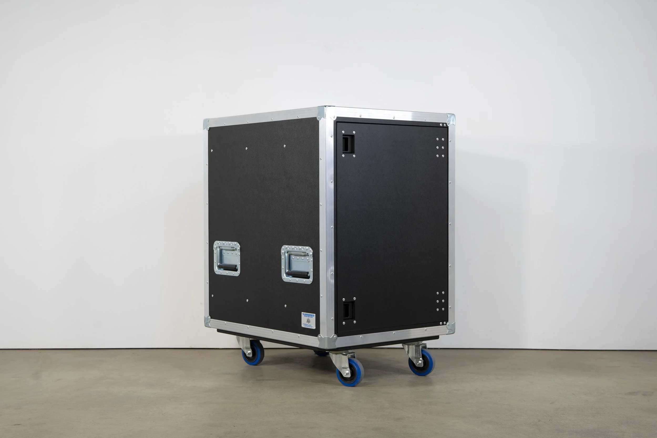 Constructed of 1/2" black phenolic haircell birch plywood, aluminum extruded framework using double angle extrusion, 8x heavy duty flat corners, 8x medium heavy duty recessed handles, 2x large heavy duty recessed slam latches, 4x caster stacking dishes, custom internal steel rack skeleton fixed between rubber shock mount pieces, 3/4" baltic birch plywood finished in black DuraTex for casterboard, 4x 4" blue casters.