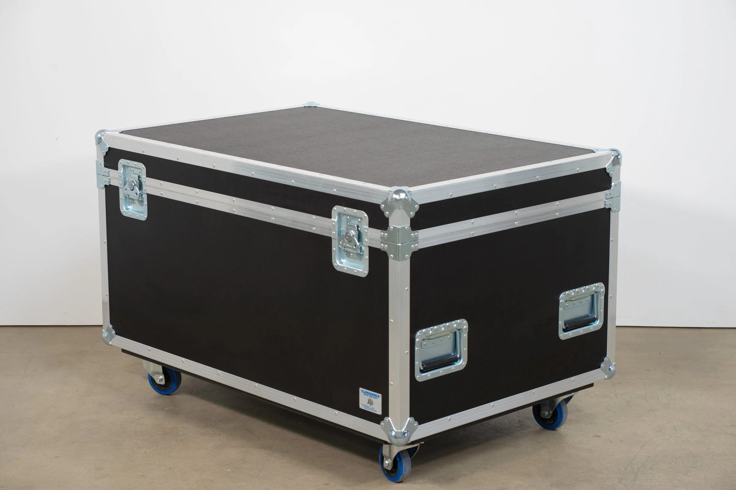 Constructed of 1/2" black phenolic haircell birch plywood, aluminum extruded framework using double angle extrusion, 8x heavy duty ball corners, 4x large heavy duty recessed handles, 2x large heavy duty recessed latches, 2x large heavy duty recessed lid stays, piano hinge, black smooth phenolic interior finishing, 3/4" baltic birch plywood finished in black DuraTex for casterboard, 4x 4" blue casters